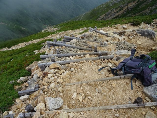 大天荘直下300m辺りのステップ箇所。数年前に作りましたが、越冬で徐々に痛むもの。土留めの石が崩れかけ、盛土全体が流されかけていました。