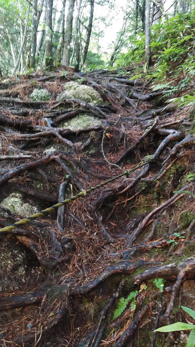 登山口から20分ほどすると、急登が始まります。木の根がむき出しに表れていてそれに足を取られるのと滑るのとで注意が必要です。この時点で、私は3回転んでいました。急坂を抜けきったところで、朝食を取る事にします。Y料理長お手製の特製弁当です。手渡してくれた際、「くれぐれも遭難するなよと」。真顔でした・・・。