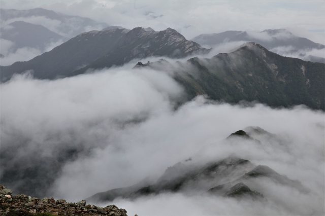 歩いているときは、纏わりつくこの雲はとても嫌なものですが、遠目で眺めると、なんともたおやかな山並みに見えます。