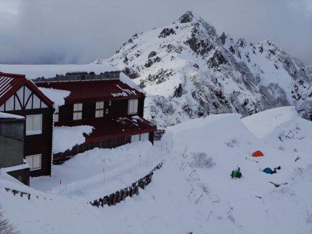 昨日から今日にかけて20㎝以上の積雪となりました。朝になると真っ白になった燕岳が姿を見せてくれました。玄関から外に出ようと思うと雪は結構深く、所によっては長靴から雪が入ってしまうところもありました。ただ、まだ小屋の東側はなんとか通行可能となっています。悪天時や強風時は小屋の西側を回るのはとても大変なので東側が通れることはとてもありがたいことです。