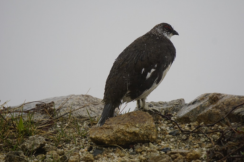 時折、雨は強く降る時もありました。しかし、外ではイワヒバリやカヤクグリが元気よく活動していて雨音の中かわいらし声が聞こえてきました。また、オスのライチョウはサンルーのそばまでやってきて、小屋の中から写真を撮らしてくれました。このライチョウくん雨の中でしたが活発に動き回っていました。夕方、その理由が分かりました。オスどおしの縄張り争いがまだ終わってないようで、雨が激しく降る中、空中戦をしているのを見かけました。