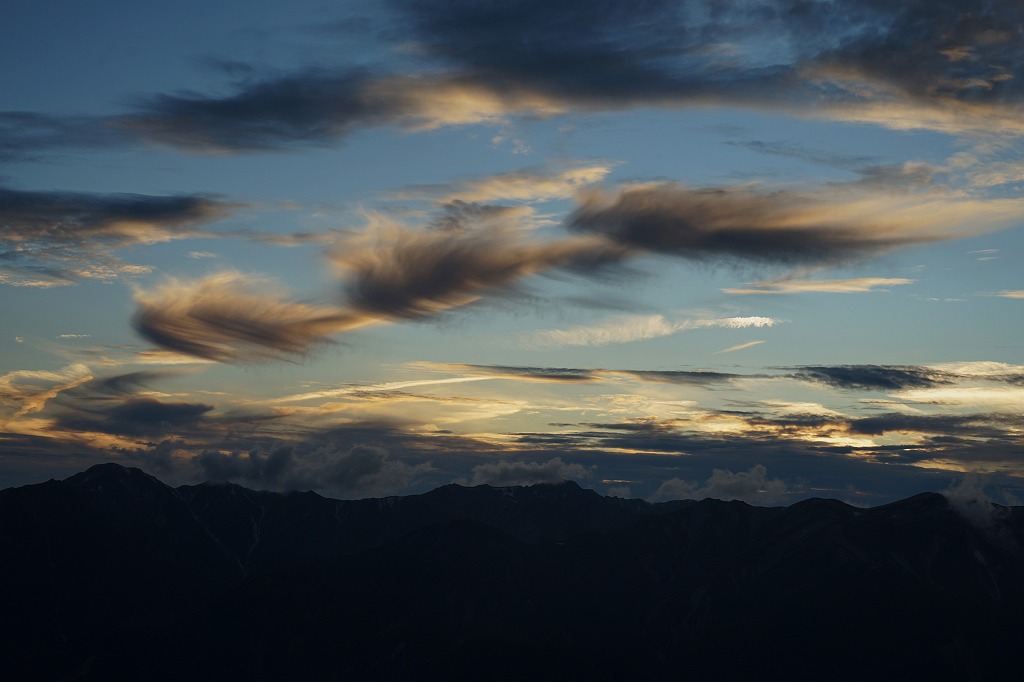 夕方になっても蒸し蒸しとした空気に包まれ、もくもくとした雲があちこちに湧き上がっていました。雲が多く、沈む夕日は見られませんでしたが、雲はオレンジ色に焼け、その中、槍ヶ岳の上に飛行機がまっすぐな雲を描きながら飛んでいきました。明日の天気予報を見ていると再び傘マークが付いています。まだ、梅雨は開けないのでしょうか。