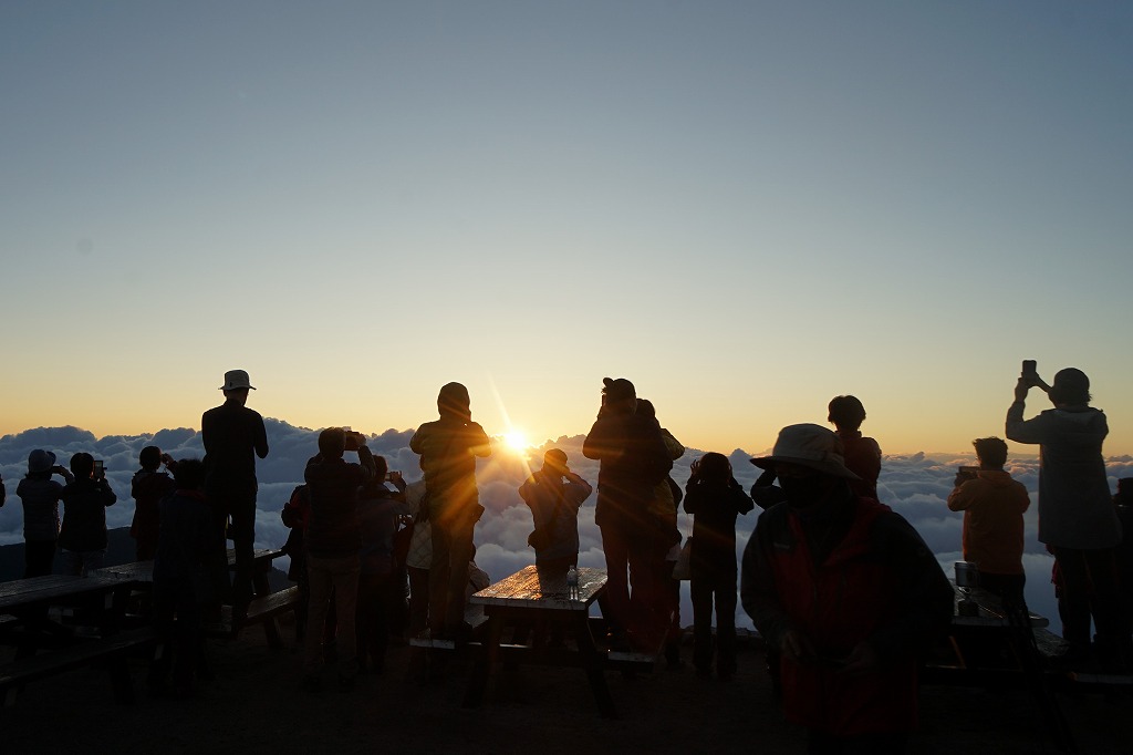 朝は7℃台まで下がり、ひんやりとした朝となりました。すっきりと晴れ渡り、また眼下には雲海が広がり、美しい日の出でした。安曇野市の穂高東中学校の皆様はとても喜んでいました。きのう頑張って登ってきた最高のご褒美となったことでしょう。