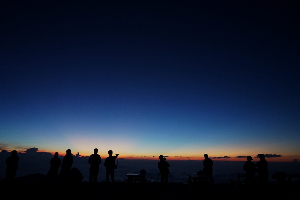 雲やガスが湧き上がる前、富士山もくっきりと見えていました。この写真にゴミのように小さく映るのがアマツバメです。このツバメが頭上を通過するときはシュッという風を切る音が聞こえます。きっとものすごいスピードなのでしょう。
