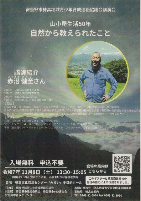 安曇野市穂高地域青少年育成連絡協議会主催で燕山荘代表赤沼が「山小屋生活50年 自然から教えられたこと」をテーマに講演をします。