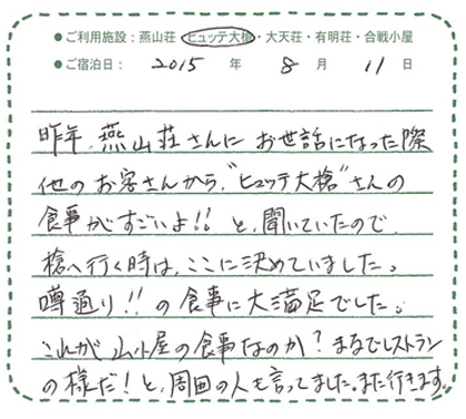 昨年、燕山荘さんにお世話になた際他のお客さんから“ヒュッテ大槍”さんの食事がすごいよ!!と聞いていたので、槍に行く時は、ここに決めていました。噂通り!!の食事に大満足でした。これが山小屋の食事なのか?まるでレストランの様だ!と周囲の人も言ってました。また行きます。