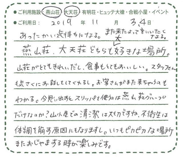 燕山荘 大天荘 あったかい気持ちになる。また来たよって言いたくなる。 2020/2/5 あったかい気持ちになる。また来たよって言いたくなる。燕山荘、大天荘どちらも大好きな場所。山荘がとてもきれいだし、食事もとてもおいしい。スタッフさんも気さくにお話をしてくれるし。お客さんがまた来ちゃうのも分かる。今思い出すとスリッパを使うのは燕山荘グループだけなのか?山小屋での清潔は大切ですね、不衛生は体調を崩す原因にもなりますし。いつもピカピカな場所。またお邪魔するときが楽しみです。 T.A様 神奈川県 41歳 女 前の記事へ 次の記事へ HOME > お客様の声 > 燕山荘 > あったかい気持ちになる。また来たよって言いたくなる。