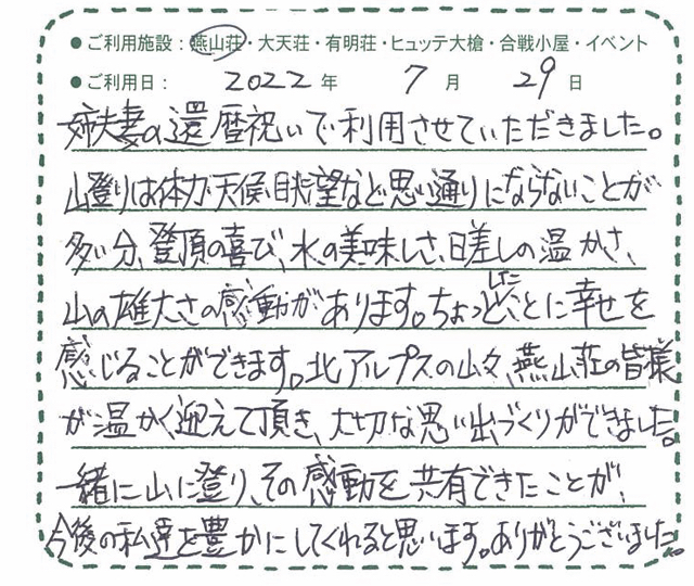 ちょっとしたことに幸せを感じることができます。北アルプスの山々、燕山荘の皆様が温かく迎えて頂き、大切な思い出づくりができました。