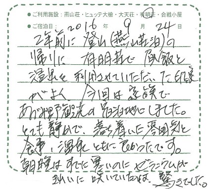今回も快適な2日間を過ごさせて頂きまして本当にありがとうございました。5年ぶりに訪れた山の残雪は前回の秋の燕岳をも越える感動でした。山荘はすみずみまできれいにされており、美味しい食事にも感謝です。そして何よりスタッフさん達の心のこもったご対応にも感謝です。今回も出発の際は慌ただしくしっかりとしたお礼の言葉も申し上げることができず、失礼しました。が、また必ず帰りたいと思います。皆様お体にお気をつけて!文末ですみませんがもう一度「ありがとうございました」。p.s.自炊場が長時間利用できたことにありがたく風影も最高でした!