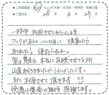 書ききれませんが、深い山中にあってとてもいい山小屋で感激しました。ありがとうございました。